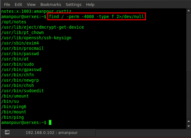 First we started to find all SUID files by typing find / -perm -4000 -type f 2>/dev/null