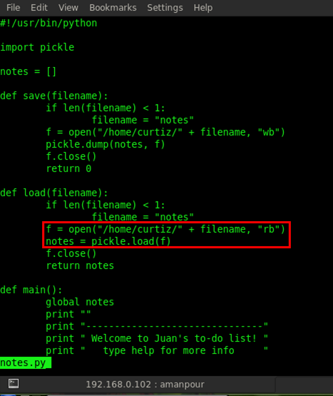 So what is notes.py? Basically notes.py is a small application for keeping notes, like Notepad. By reviewing the source code of the notes.py file we identified that any file executable from this application is excuted as home/curtiz. Curtiz is another user on this system and our next target is to take over in his account.