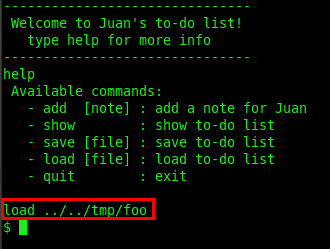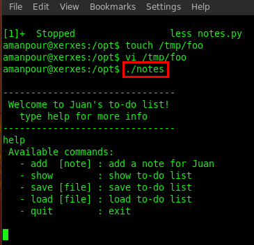 By using the help command we can see all the usage commands of the notes application. Now its time to load our shell file by typing load../../tmp/foo