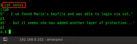 There is a message that somebody found Marie's keyfile and he was able to login via ssh. Now the question arises here: who is Marie? Is she an another user? But earlier when we checked out the home directory for all users there was only three: amanpour, curtiz and delacroix. We again opened the notes.bak file and there was also the same message. So we tried to grep the Marie password by typing grep Marie /etc/passwd