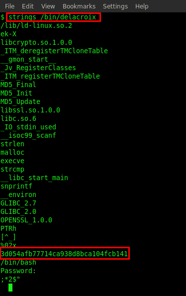 And the result answered our question: Marie is delacroix. So we opened the /bin/delacroix file by using strings /bin/delacroix. The strings command is mainly useful for determining the contents of non-text files.