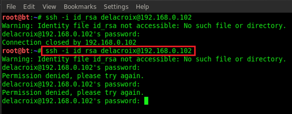 Again we tried to login via ssh from our system by typing ssh -i id_rsa delacroix@192.168.0.012 and then the password VonBraun.