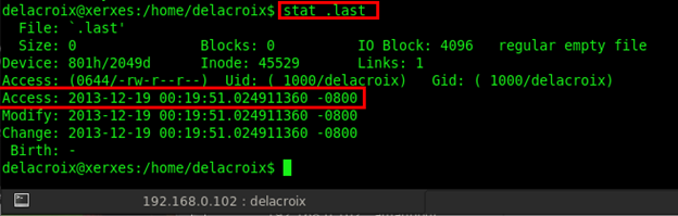 Now we will check for all files' status by using the stat command and the users when they last logged-in or logged-out since that file was created. So type in stat .last