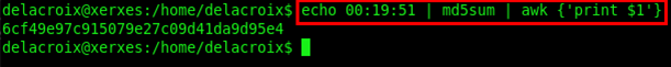 Now we can see the exact access time is 00:19:51. So, considering this, we can now extract the relevant part of generate.sh and compute the MD5 it would have provided Marie back when she last ran the script. So We typed echo 00:19:51 | md5sum | awk {'print $1'}