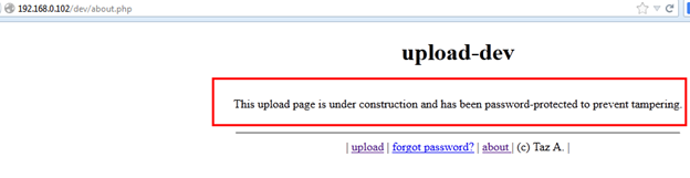 First we tried to upload a normal image file, but the page needs a valid password for uploading any file. Otherwise it shows an error that the page is under construction and is password protected to prevent data tampering.