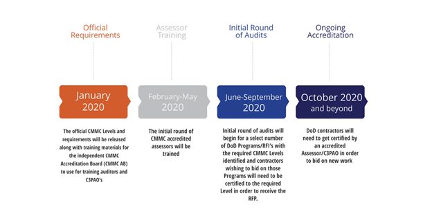 Because self-certification will not be permitted, the DoD has gone on to provide initial training guidance to the Cybersecurity Maturity Model Certification Accreditation Body (CMMC-AB) in January 2020, at which time an initial round of accredited CMMC Third Party Assessment Organizations (C3PAOs) and individual assessors trained and tested will evaluate companies’ CMMC levels.