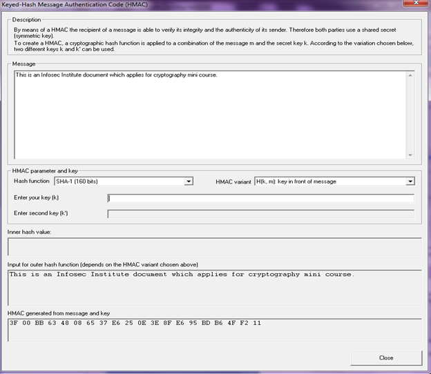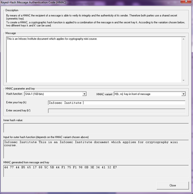 Enter key value "Infosec Institute" and see the difference in the generated HMAC. In this case I have chosen the HMAC to be in front of the message.