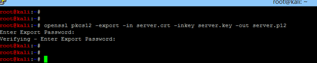 - Create PKCS12/PFX bundle to encrypt the key and cert. It will input password two times. Remember this password because if this p12 file has to be used in Windows/Linux, then this password will be required.Runopenssl pkcs12 -export -in server.crt -inkey server.key -out server.p12