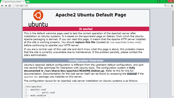 - Access the default Web Interface of Apache Server on Ubuntu Linux by typing http://192.168.1.133/