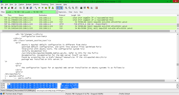 - Analyze the traffic between client and server by typing "ip.addr == 192.168.1.1 && ip.addr == 192.168.1.133" in the filter textbox. The unencrypted/plain page is visible in the figure.