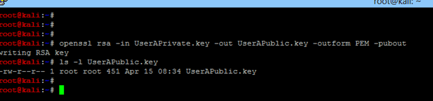 - Generate corresponding public key. Run openssl rsa -in UserAPrivate.key -out UserAPublic.key -outform PEM -pubout