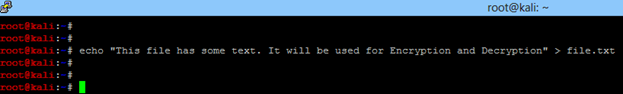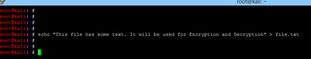 - Create a plain text file. Run echo "This file has some text. It will be used for Encryption and Decryption" > file.txt