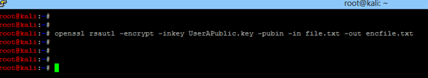 - Encrypt the plain text file with the public key. Run openssl rsautl -encrypt -inkey UserAPublic.key -pubin -in file.txt -out encfile.txt
