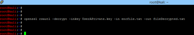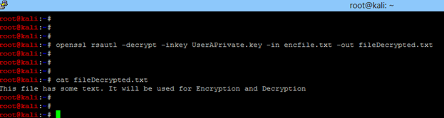 - Decrypt the file with the private key. Run openssl rsautl -decrypt -inkey UserAPrivate.key -in encfile.txt -out fileDecrypted.txt