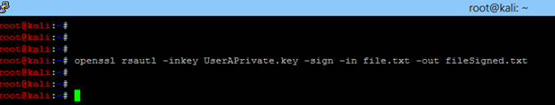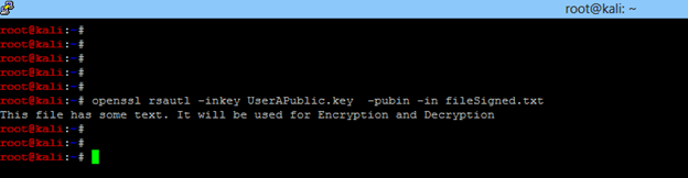 - Encrypt the plain text file with the private key. Run openssl rsautl -inkey UserAPrivate.key -sign -in file.txt -out fileSigned.txt