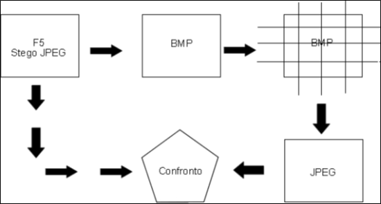 For these features, the F5 has a good resistance also against statistical attacks. However, in order to improve the capacity of detection of information hidden through F5, we can approach the problem in a different way. For example, an approach worth mentioning is surely the one proposed by J. Fridrich. Among the various technicalities and mathematical relationships, the main steps that describe the attack of F5 proposed by the author can be summarized and simplified as follows:
