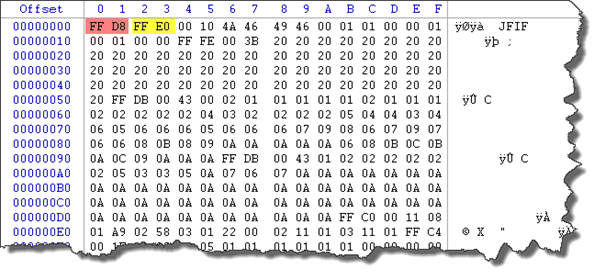 Let's open our image file using a hexadecimal editor and focus on its structure; now we know that every JPEG file starts by 0xFFD8 and ends with 0xFFD9: