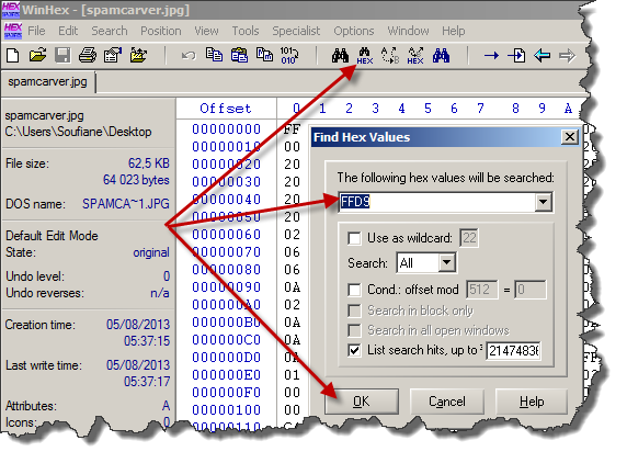 Let's try to find the trailer of our file (the End of Image Marker) which is equal to 0xFFD9, so using your hexadecimal editor try to find the value "FFD9". To do this using WinHex, click on "Find Hex Values" on the window that appears taped in the hexadecimal value you want to find then click "OK"