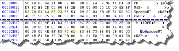 Remember the name of the file inside the zip file? An eight space name and this kind of file names can in fact cause some unzipping problems, so let's get back to the dumped zip file and using the hexadecimal editor, we will change the name by something more usual. What you have to do is making a hexadecimal search (like the one we did before) and try to find "2020202020202020" then changing it by whatever you like.