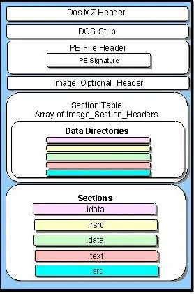 A PE executable basically contains two sections, which can be subdivided into several sections. One is Header and the other is Section. The diagram below explains everything