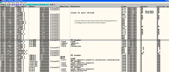 After that, if we want to check the details of section of PE header using olllydbg, we have to open AppearanceàPE header mode in memory layout, which is the left corner button of the ollydbg GUI. Check below and we can clearly see all the headers and sections.