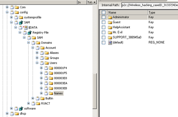 However, 4 of them are default Windows accounts and were never used. The one account mainly used, was that of 'Mr. Evil'. This information is suggested by the sub-keys found under 'Users' at the following path: