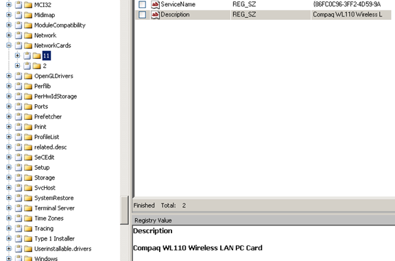 WINDOWS/SYSTEM32/CONFIG/SOFTWARE/NTREGISTRY/MICROSOFT/ WINDOWS NT/CURRENT VERSION /NETWORKCARDS/2/DESCRIPTION