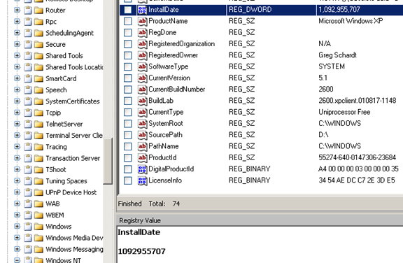 WINDOWS/SYSTEM32/CONFIG/SOFTWARE/MICROSOFT/WINDOWS NT/CURRENT VERSION/INSTALL DATE