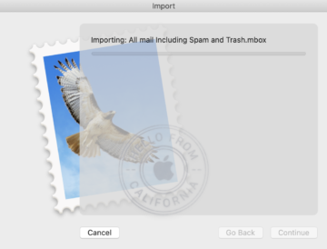 Launch Mail application and navigate to File | Import Mailboxes. We should see the following window. Choose Files in mbox format as we obtained a copy in mbox format.