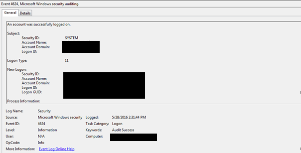 - This screenshot shows an account failed to login (EventId 4624), and LoginType is 11 which means that cached credentials are used to login since my machine cannot contact my company's DC.