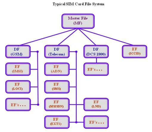 As can be seen in the above figure, dedicated files are subordinate directories under the MF, their contents and functions being defined by the GSM11.11 standards. Three are usually present: DF (DCS1800), DF (GSM), and DF (Telecom). Also present under the MF are EFs (ICCID). Subordinate to each of the DFs are supporting EFs, which contain the actual data. The EFs under DF (DCS1800) and DF (GSM) contain network-related information and the EFs under DF (Telecom) contain the service-related information.