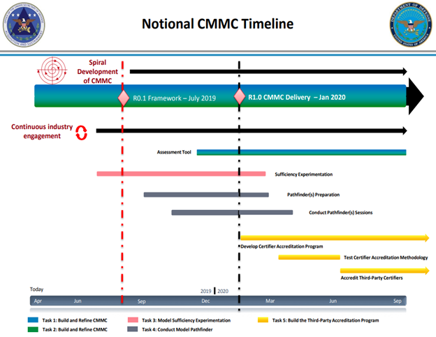 Katie Arrington described the following timeline for CMMC during a presentation for a group of DoD contractors on May 23, 2019 to announce the proposed program: