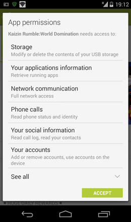 I installed a new game on my phone a couple of days ago, Kaizin Rumble: World Domination. These are some of the permissions the app asked for before I agreed to install it.
