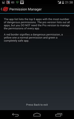 So, if you install the free version of Permission Manager, as I did, you can see the top five apps on your device which have the greatest number of permissions. But if you buy the paid "Pro" version, you'll see a list of all of your apps and their permissions, listed from the most permissions to the least.