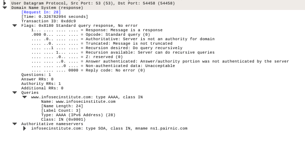 - Under Queries, you can see that the request is made for www.infosecinstitute.com for record type A in internet (IN) class.