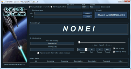 LOIC is one of the most popular DoS attacking tools freely available on the internet. The famous hacking group Anonymous has not only used the tool, but also requested internet users to join their DDoS attacks via IRC.