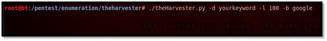 #./theHarvester.py –d yourkeyword –l 100 –b all