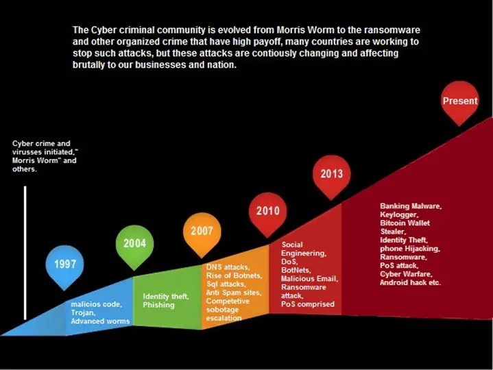 The graph shows that how cyber attacks has changed over the years. Now the most widely used attacks are ransomware, point of sale attacks, Botnets, Phishing attacks, Cyber Warfare and network traveling worms. These attacks are popular nowadays and affecting millions of people around the world.