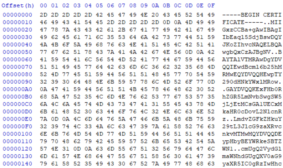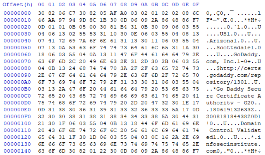 The image above shows a DER-encoded certificate opened in a hex editor. This is a binary file, including strings describing the certificate authority (GoDaddy) and the website that the certificate maps to (infosecinstitute.com). The main issue with this encoding of the certificate is that it includes unprintable ASCII characters, which some Internet protocols (like SMTP) cannot transmit or process.