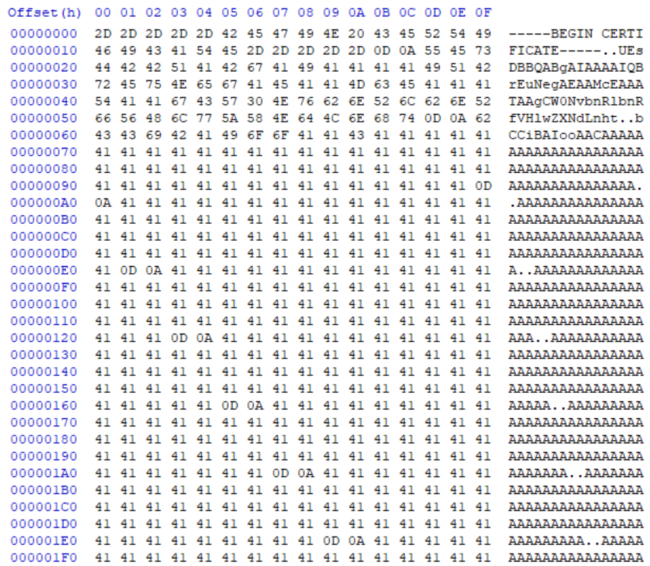 The magic number for a DER-encoded certificate is 0x3082. Every legitimate certificate will start with this in the DER-encoded format. However, the certificates that we’re looking at here are PEM-encoded, meaning that they use Base64 encoding after the -----BEGIN CERTIFICATE----- tag. The Base64 encoded version of 0x3082 is MII (add a = to the end as padding to test). Now, take a look at the malicious certificate, which starts with UEs. That alone is enough to show that this isn’t a real certificate.