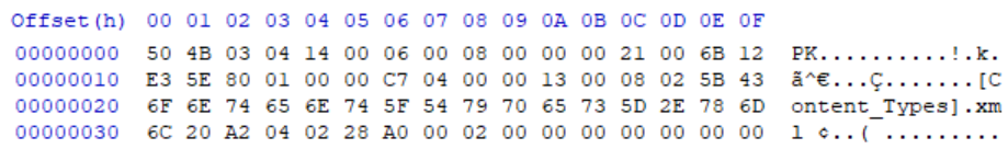 Returning to magic numbers, we find that PK is the signature for a ZIP archive. After extracting the archive, we see the file structure of an Excel document (which is stored as a ZIP archive). Examining the contents of the file reveals that it is a macro-enabled Excel document (.xlsm).