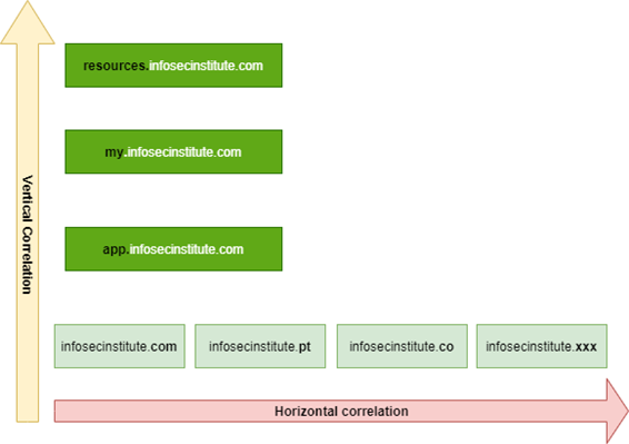 - Horizontal domain correlation: Horizontal domain correlation is a process of finding other domain names, which have a different second-level domain name but are related to the same entity.