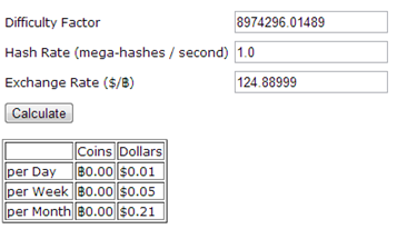 Using the following parameters today (April 24, 2013) we obtain the following calculation related to a single day of mining activity.