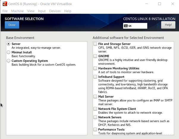 Select the desired option; for example, if you want to create an infrastructure server to run the complete network operation, select this option to get all the required packages installed. Similarly, it goes to the other option as well. Select the server with GUI to get the server installed with the graphical interface option, you can select the add-ons at this moment or get them whenever you need them. Click “done”; it will check the software dependencies and you will see the confirmation in a couple of seconds.