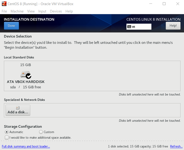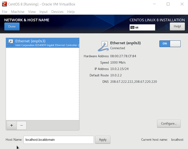 Next, click on the installation destination and select the newly created disk space. In the network and hostname setting, enable the network. You are done!