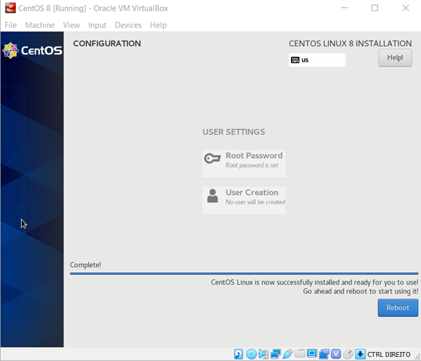 After a few minutes, click on “Reboot” button to start the operating system. At this moment, you need to remove the disk of the CentOS, if not, a new installation can start. To do this, stop the virtual machine at the first start after the installation process. For this, click on “Options”, “Storage” and over the Controller: IDE click on “Remove Attachment”.