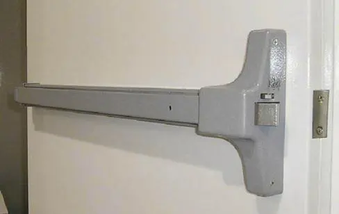 Common in business, panic bars provide convenience and ease of egress in case of emergency. However, an intruder with a crowbar has no problem gaining entry if proper steps are not taken. Figure 13-17 shows a panic bar. Note the lack of a deadbolt. The only thing securing the door is a common latch.