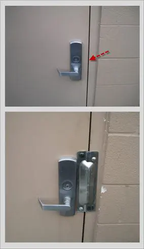 Figure 13-18 shows an external view of a panic bar installation. The red arrow in the top photo shows the location of the latch securing this steel door. Placing a crowbar here provides enough purchase to free the latch. The bottom photo shows a simple control to prevent crowbar access: installing an inexpensive latch plate protector. Note the damaged concrete in the photo. The business owner installed the plate after a break-in.