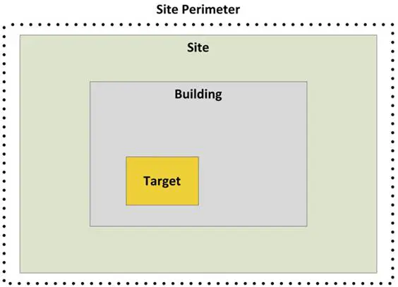 Deterrence requires barriers: psychological, physical, or both. We should never expect barriers to stop a motivated intruder. Instead, they provide a level of effort and planned delay. Figure 13-2 shows a layered approach to barrier use: site perimeter, building walls and doors, and internal walls and doors.